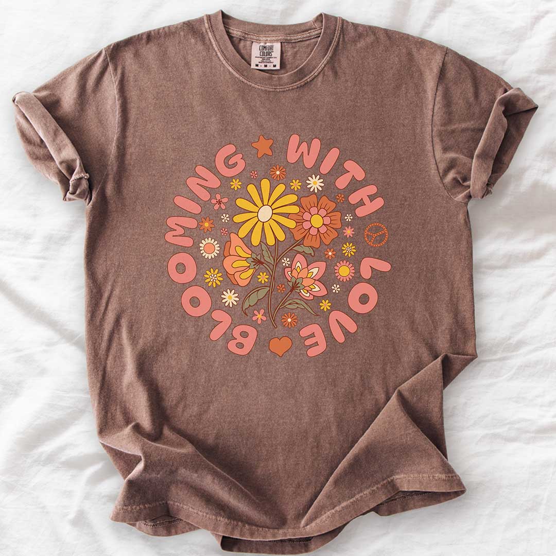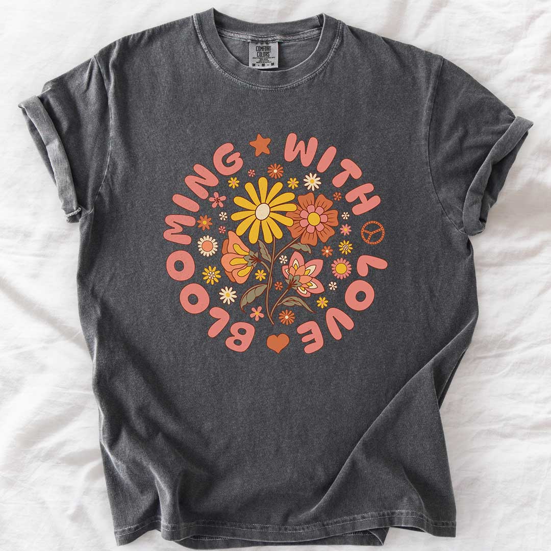 Spread good vibes in this soft, vintage-wash Comfort Colors® tee, featuring a cheerful “Blooming with Love” design surrounded by bright, retro-style flowers. 🌼💛