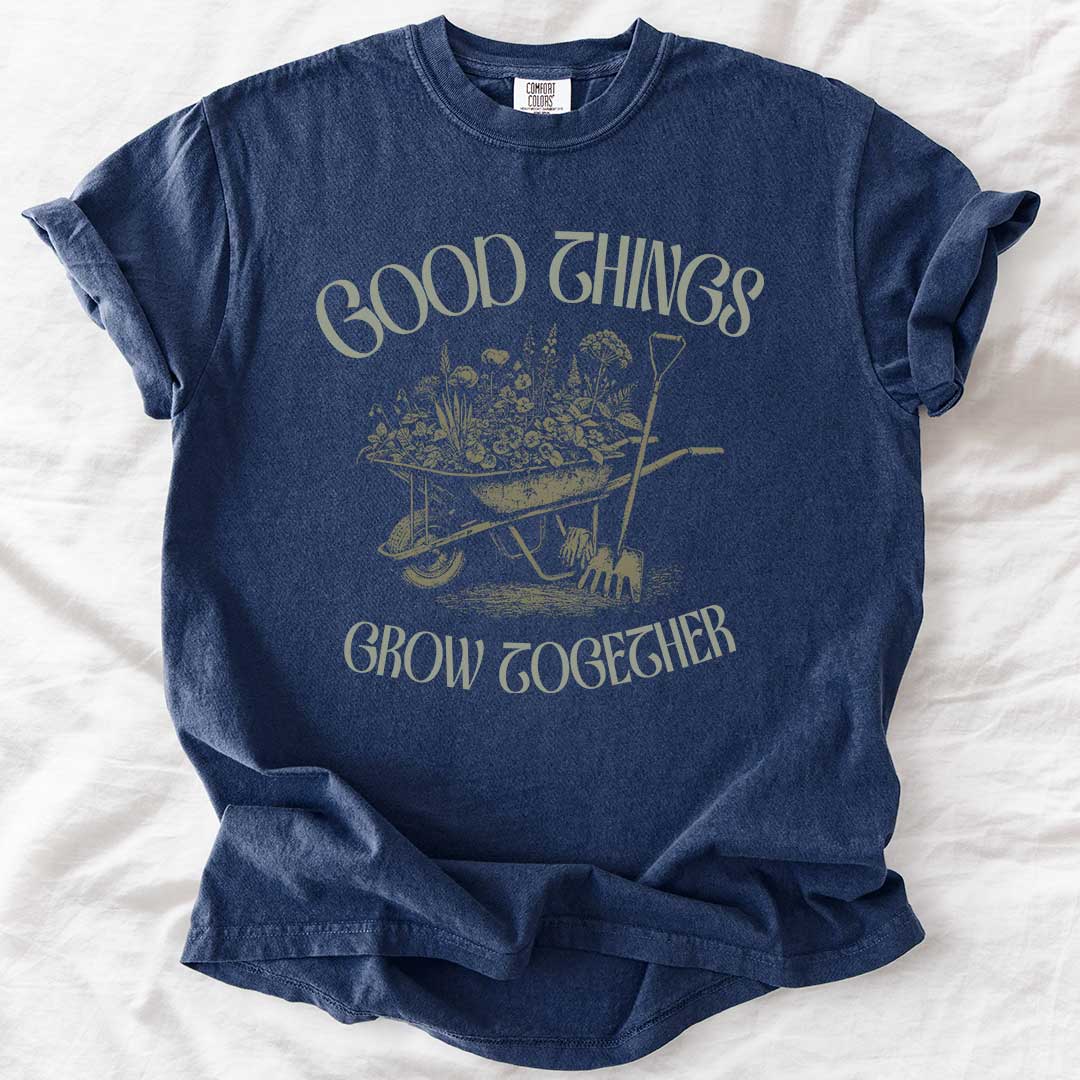 A reminder that life blooms best side by side 🌱✨ This soft, vintage-wash Comfort Colors® tee features the rustic “Good Things Grow Together” design with a wheelbarrow of flowers and garden tools.