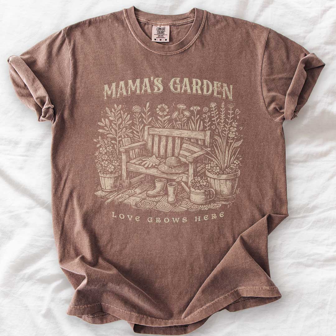 Where love and flowers grow 🌼🌱 This soft, vintage-wash Comfort Colors® tee features the rustic “Mama’s Garden — Love Grows Here” design, complete with a cozy bench surrounded by blooms and garden tools.